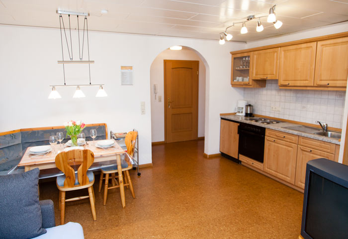 Ein gemütlicher Wohn-und Essbereich mit Sitzecke, Küchenzeile, Sofa und Fernseher lädt